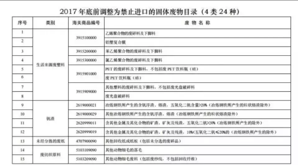 中国在送交WTO中的文件表示,一般可回收利用的固体垃圾中,常掺杂有为数不少的高污染垃圾与危险性废物,污染中国环境,为了保护环境与人民的健康,中国要调整垃圾进口法规,拒收高污染的固体废弃物,禁令将于2017年年底生效。
